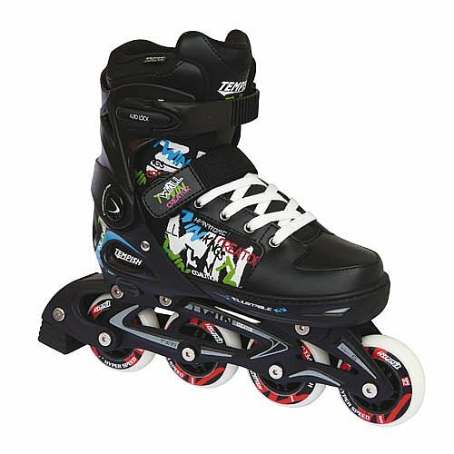 Juniorské nastaviteľné korčule s novým street dizajnom určené na rekreačné a kondičné korčulovanie. Stredná a vysoká záťaž pre začínajúcich i pokročilých korčuliarov. Stupeň únosnosti športového zaťaženia je 4. Korčule majú jednoduchý a pohodlný systém nastavenia veľkosti tlačítkom na bočnej strane skeletu. Ide o veľmi kvalitné juniorské korčule ako dizajnom, tak i konštrukciou skeletu a podvozku. Súčasťou sú náhradné farebné šnúrky. Os má priemer 6 mm a dĺžka je 33 mm. Veľkosť koliesok pri veľkosti 33 - 36 (70 mm), 37 - 40 (72 mm), 40 - 43 (76 mm) . 2-dielny skelet vyrobený v kombinácii PP/NYLON, šnurovanie spevnené pásom na suchý zips, jedna obojstranná pracka so systémom AUTO LOCK. Vkladacia vložka je anatomicky tvarovaná, spevnená na vnútornej strane, s komfortným systémom odvetrania vnútorná vkladacia stielka, luxusná anatomická bandáž. Podvozok zo špeciálnej odľahčenej AL zliatiny, 3D konštrukcia.